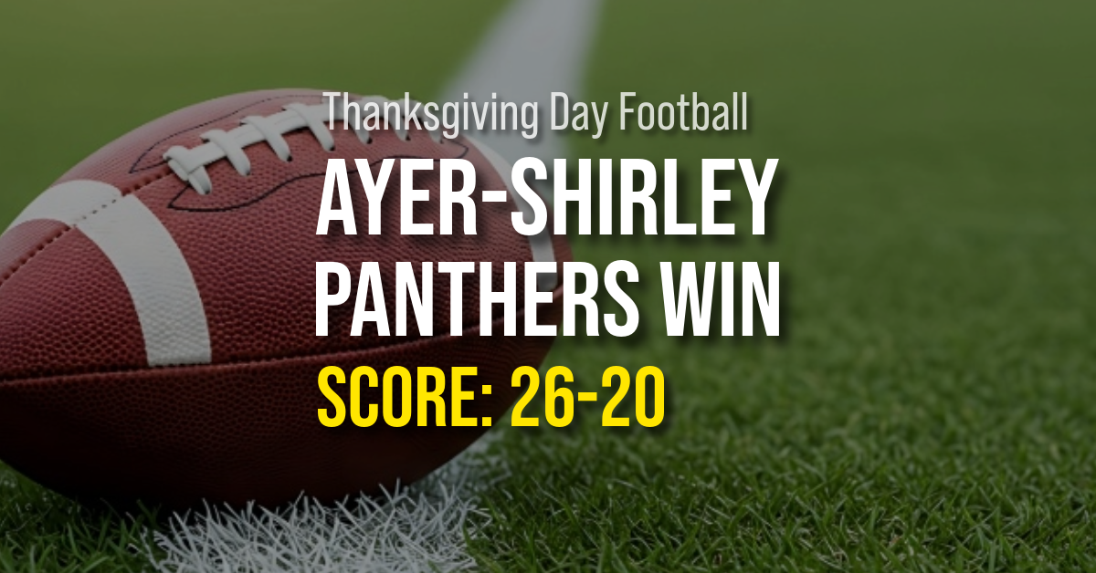 In high school football, the Ayer-Shirley Panthers win the Thanksgiving Day game against the Littleton Tigers, 26-20, after a double-overtime (Source: The Lowell Sun reporting). Subscription access required. The game was played at Alumni Field in Littleton on Thursday, Nov. 27, 2025.